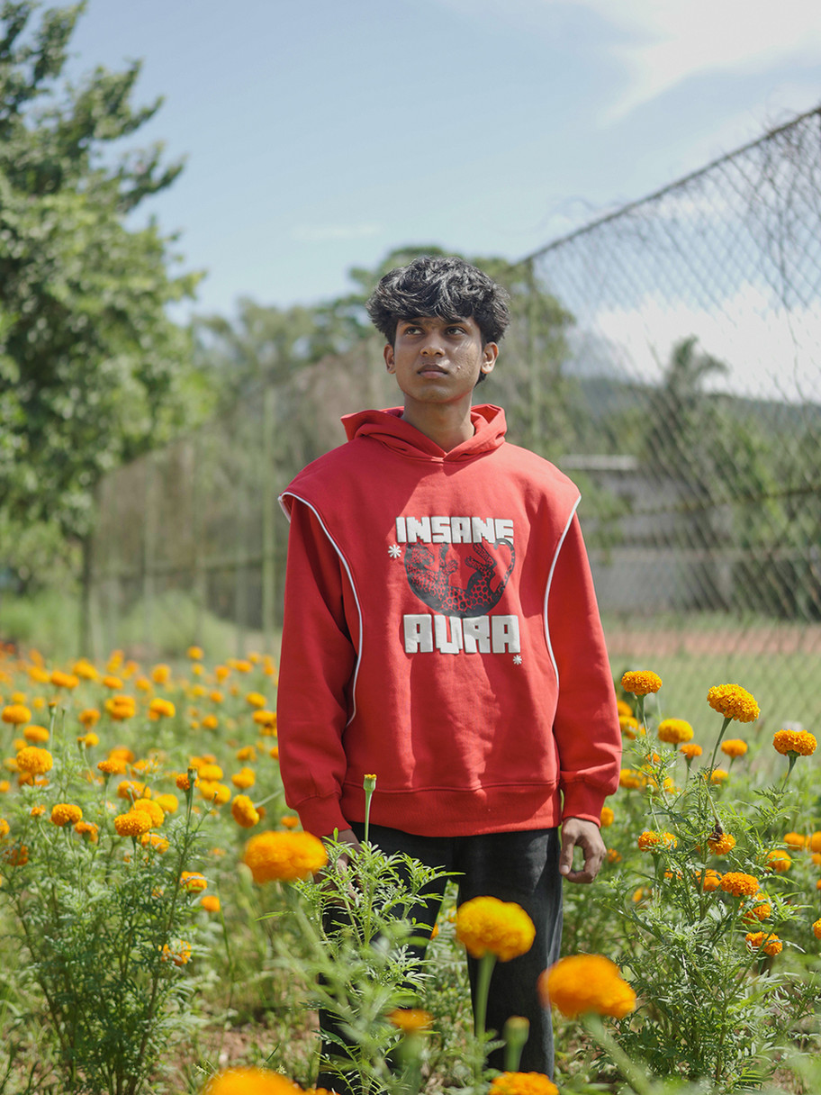 Level up your fit with the "Insane Aura" Hoodie. This isn't your average hoodie—it's heavy, it's premium, and it's built to stand out. We crafted this right here in India using a thick, cozy 420 GSM, 100% cotton fleece fabric. The eye-catching graphic pops off the chest, featuring a cool mix of screen print and textured puff print. Slip into this and feel the quality. Exclusive to Rampz