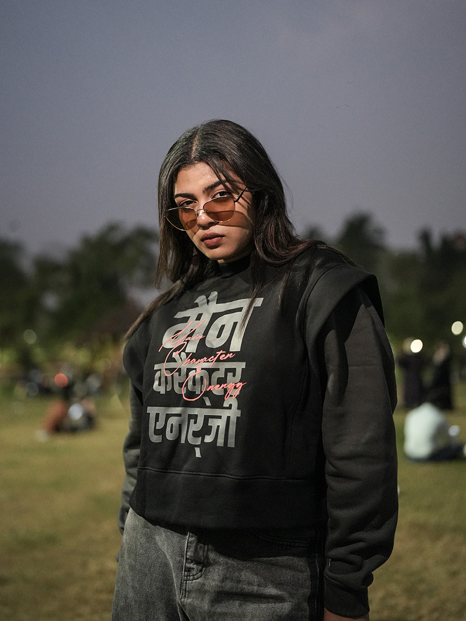 This striking crop sweater from Rampz fuses Korean fashion structure with local Indian language artistry. Crafted from heavy-duty 380 GSM, 100% Cotton Fleece fabric, it offers a premium, warm feel. The design features a cropped silhouette, bold shoulder detailing, and an empowering graphic in a local script, creating a unique and high-impact style statement.